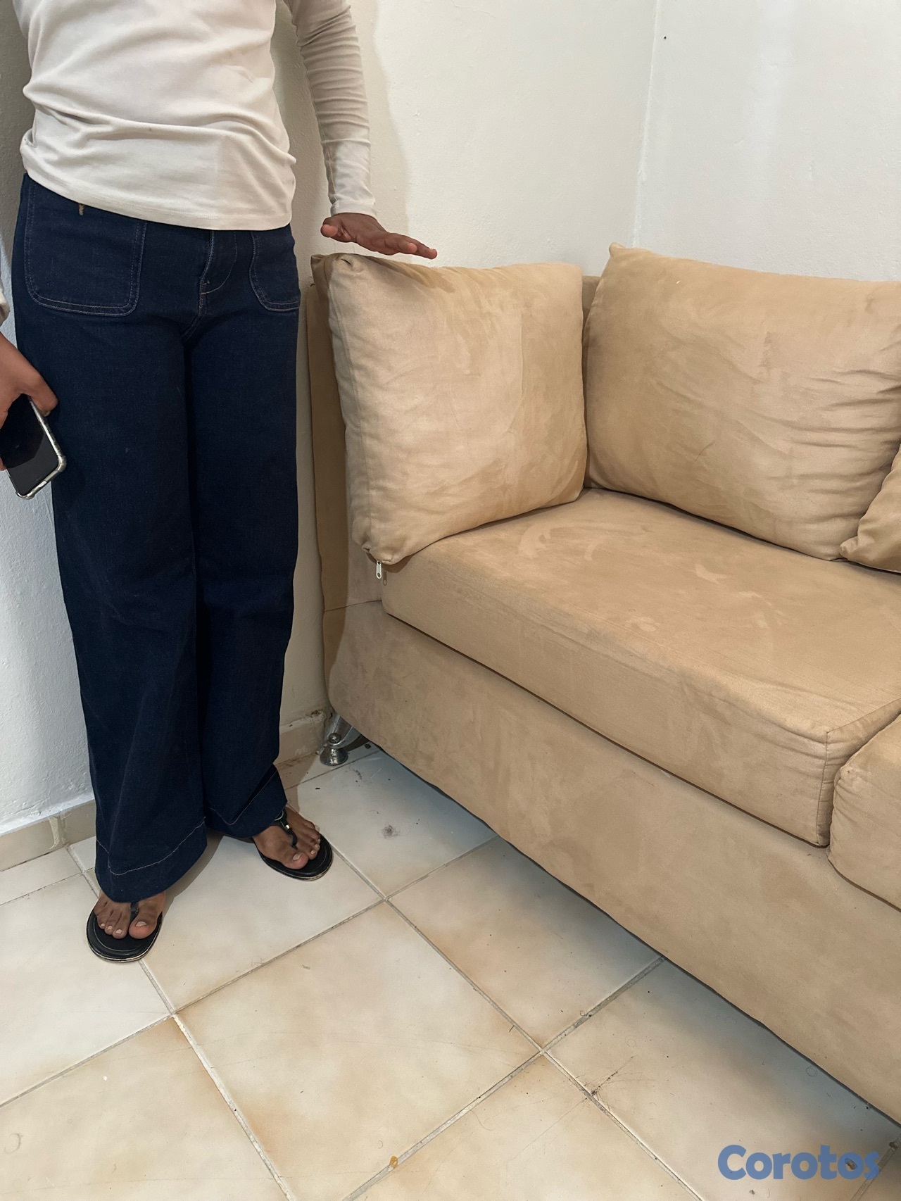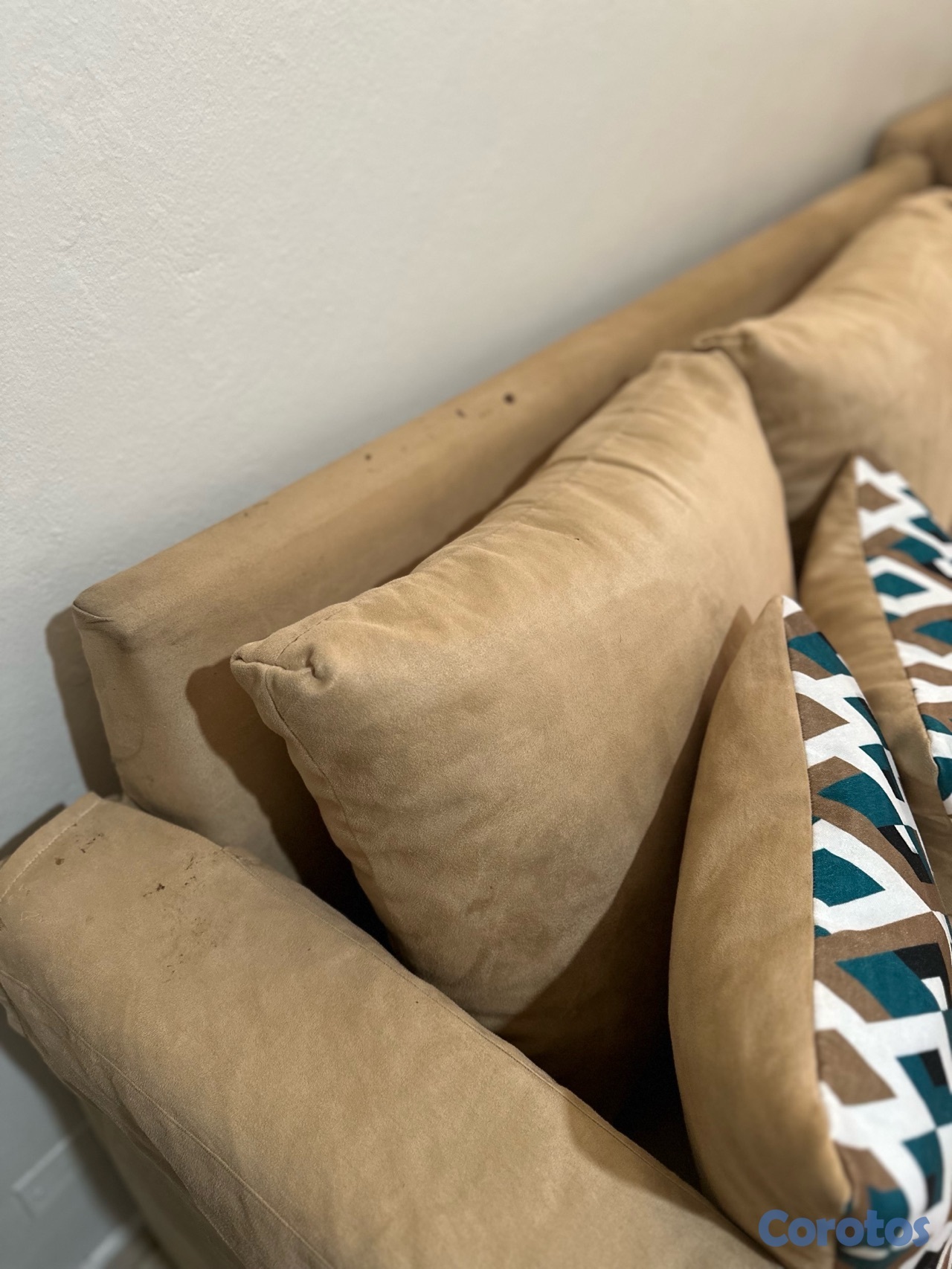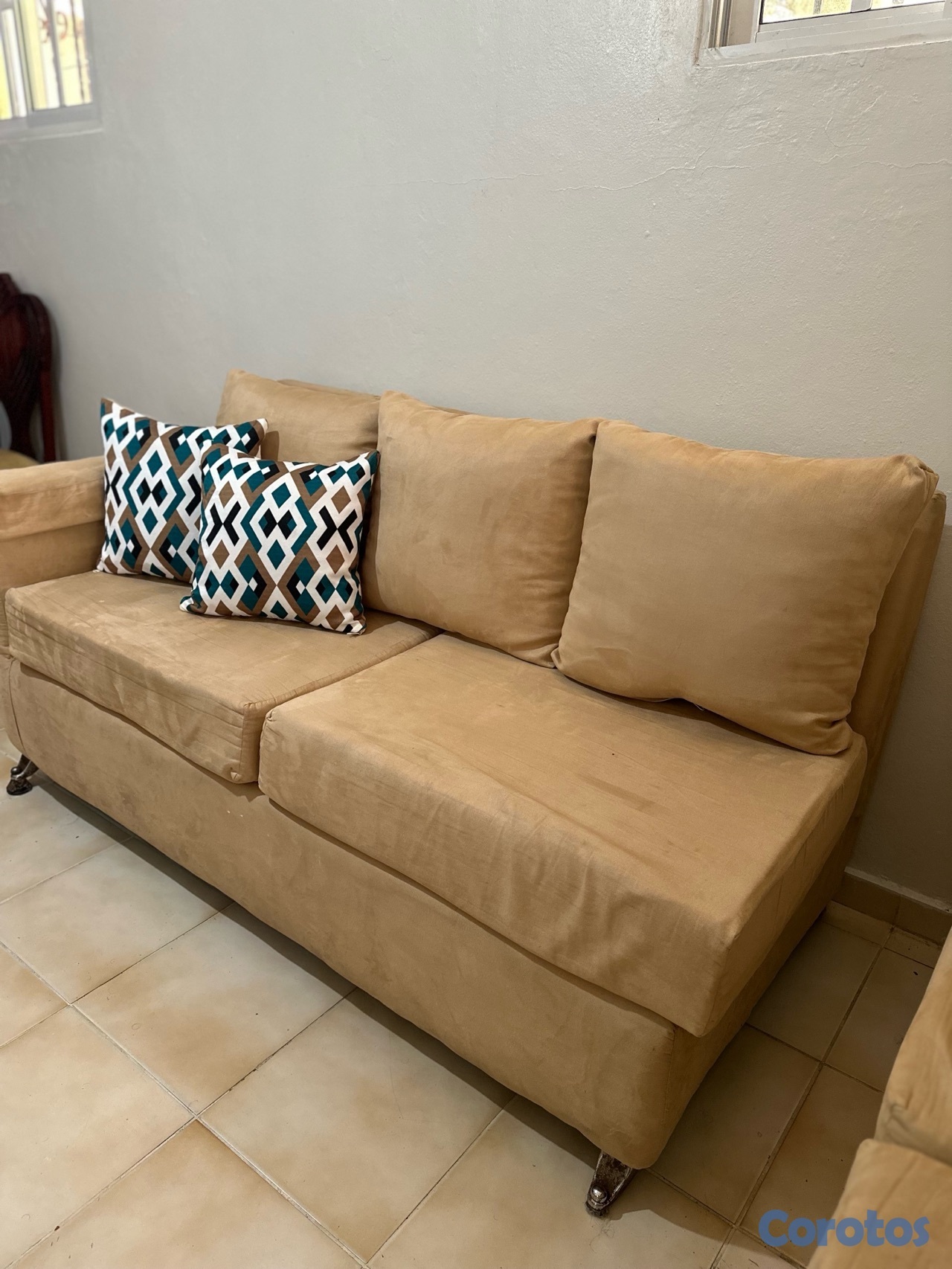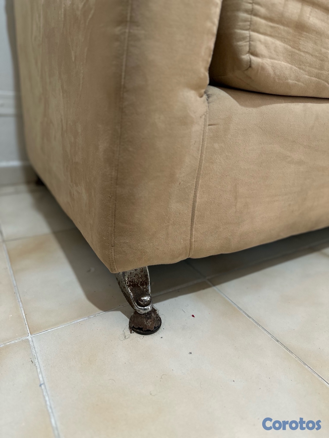 Mueble en L tela de pana crema, estructura interna en buen estado, los forros tienen algunas manchas, y dos cojines tienen ziper defectuoso, las patas por el agua se han oxidado, incluye los cojines.