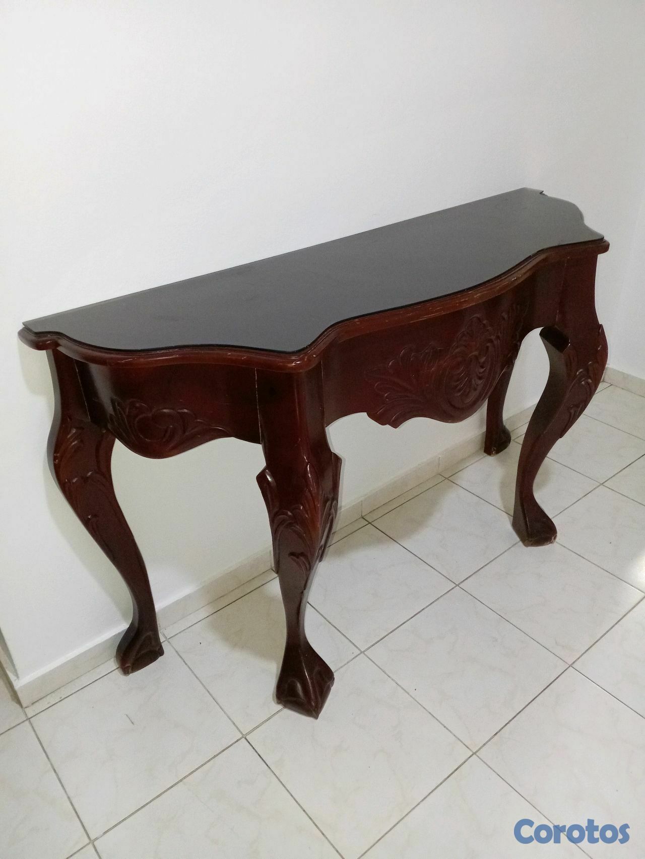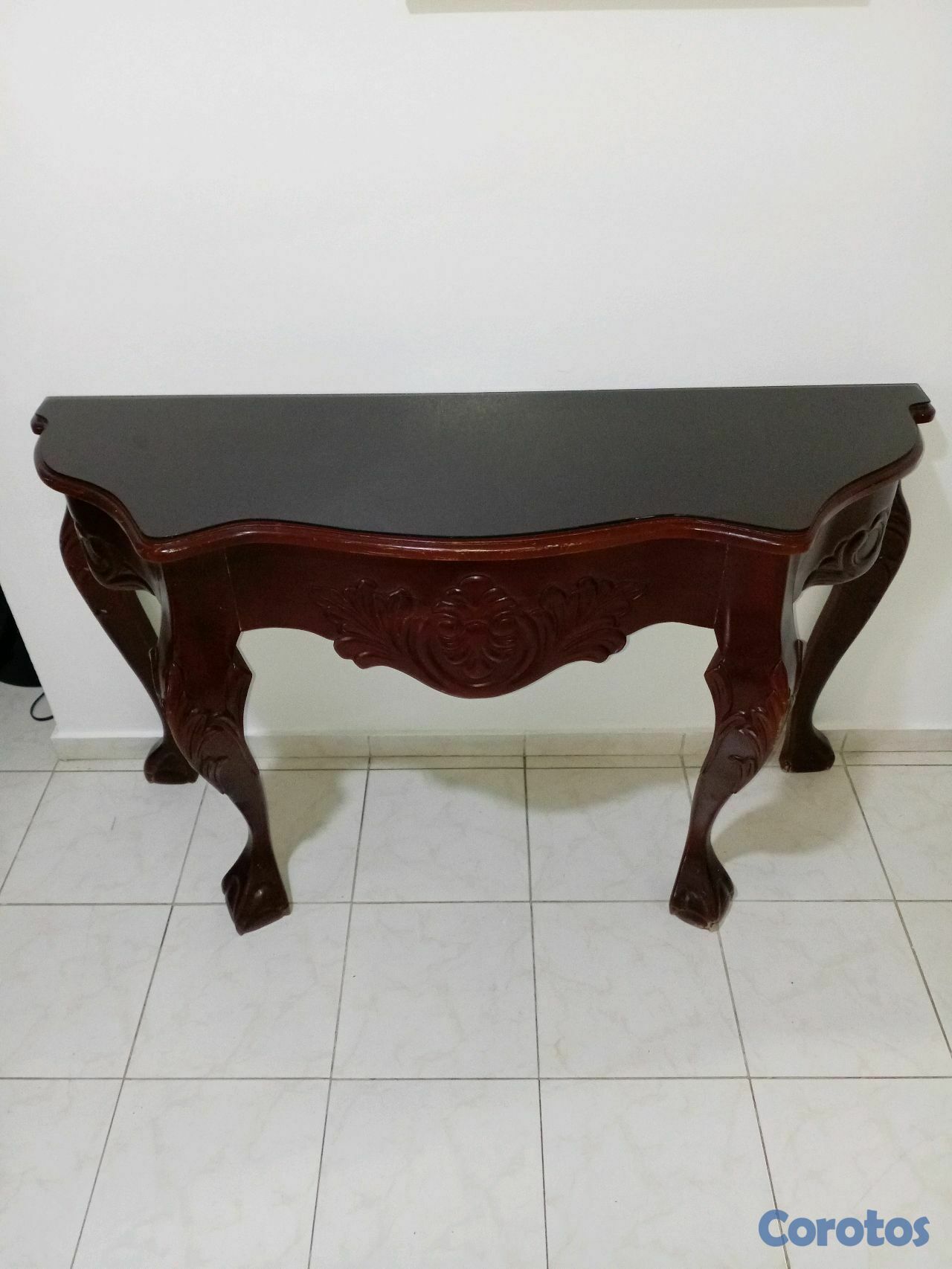 Repisa clásica de caoba con tope de cristal, en excelente condición.