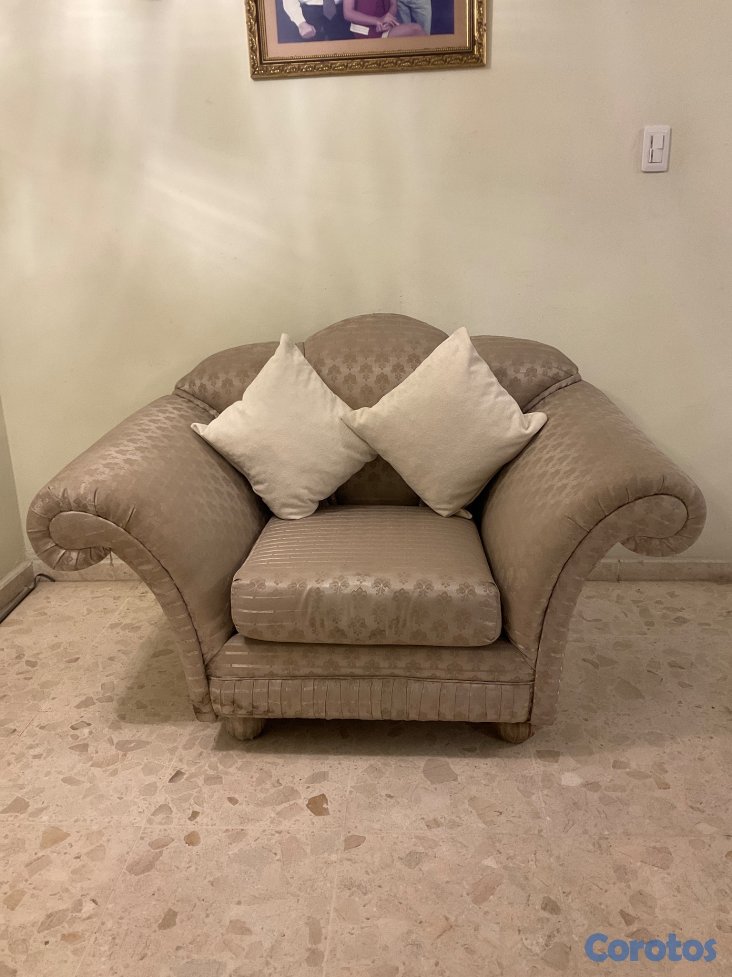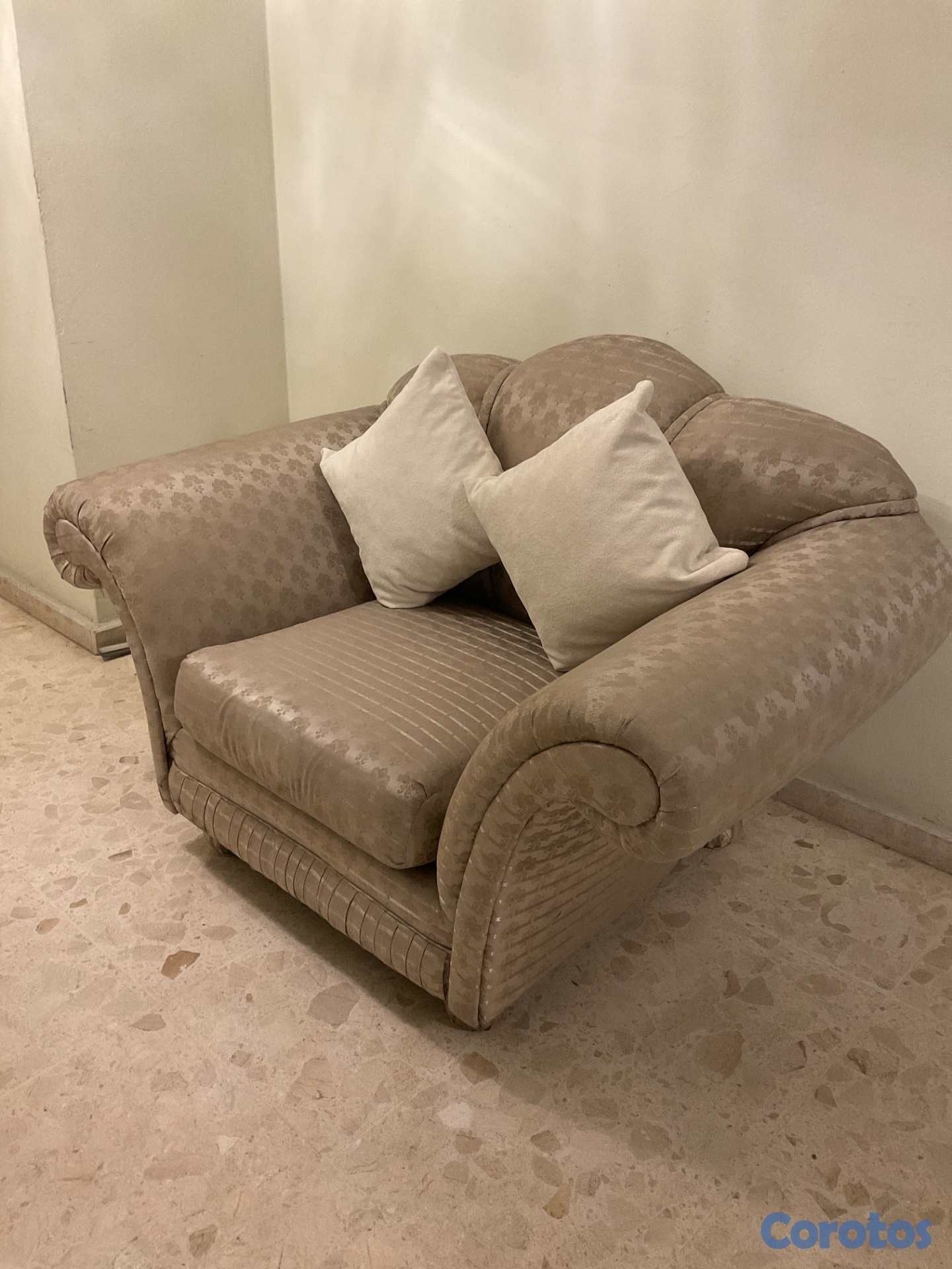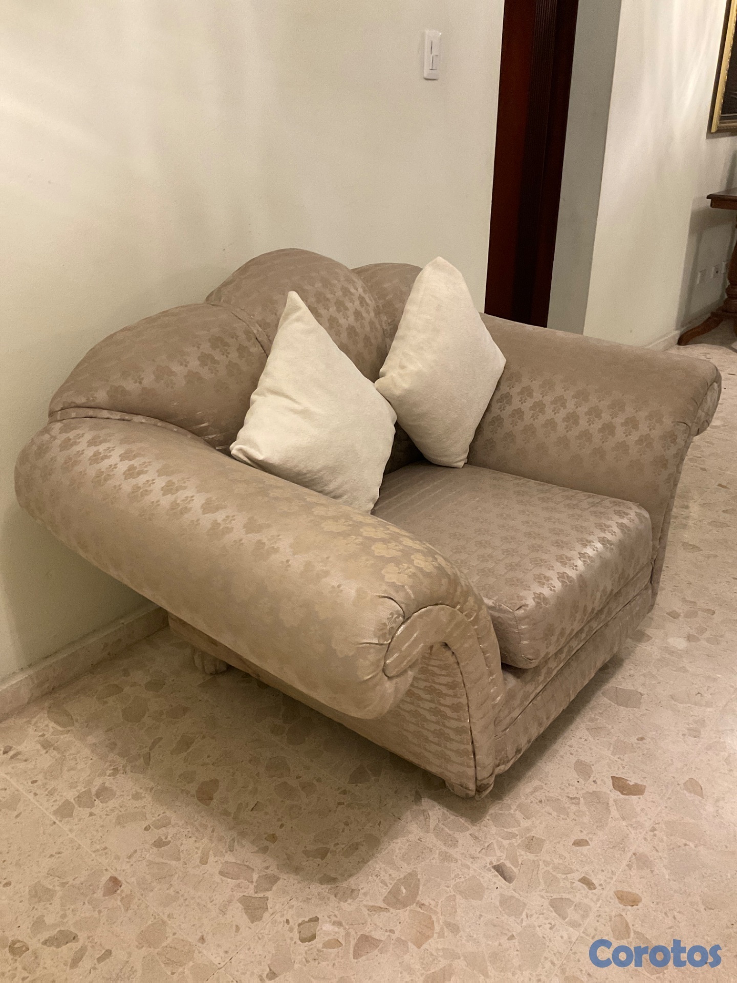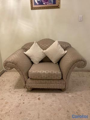 Sillón tapizado en tela jacquard, con elegante diseño floral en relieve. Tela gruesa, resistente y de buena durabilidad. Cómodo, firme y en buen estado. Ideal para sala, recibidor u oficina.
