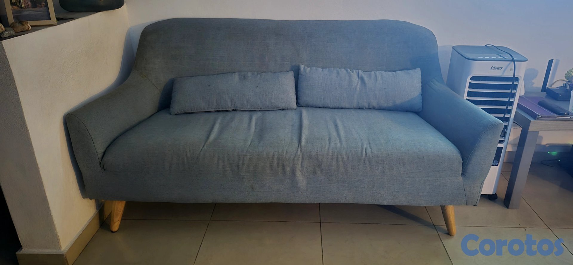 ​Se vende sillón de dos plazas en color azul, ideal para cualquier tipo de decoración moderna o nórdica. No es un mueble desechable; tiene una estructura de madera sumamente sólida y firme, nada de hundimientos ni ruidos extraños al sentarse.