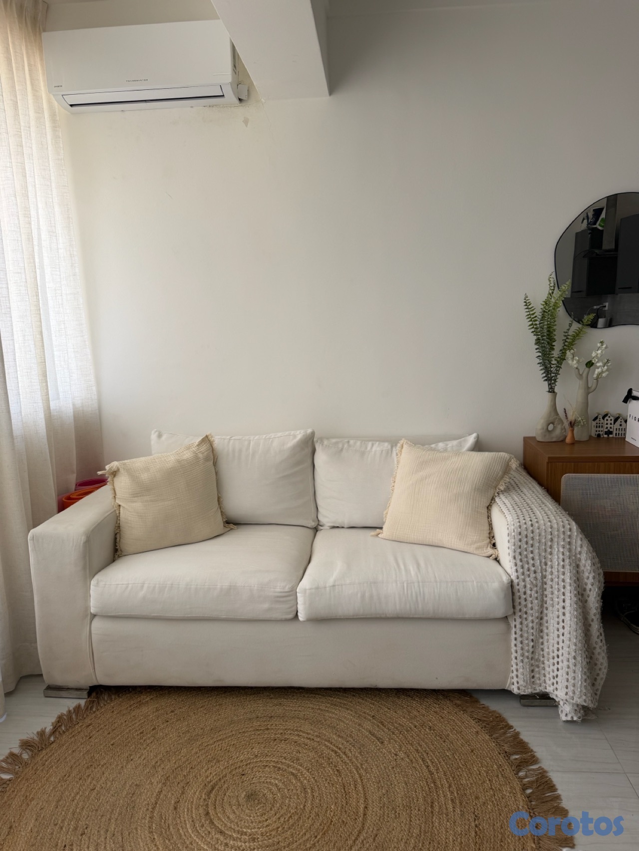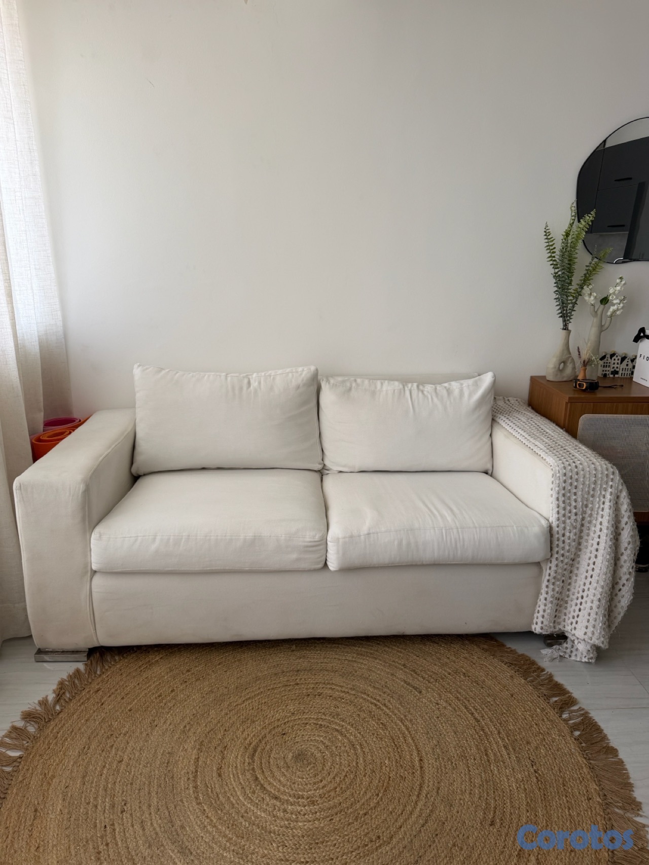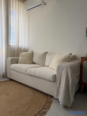 Sofá de 2 plazas en color blanco/crema, muy cómodo y en buen estado. Diseño moderno y neutro, fácil de combinar con cualquier espacio. Tapizado en tela suave. Se vende tal como se ve en las fotos + la mantq. Perfecto para espacios luminosos y estilo minimalista o natural.
