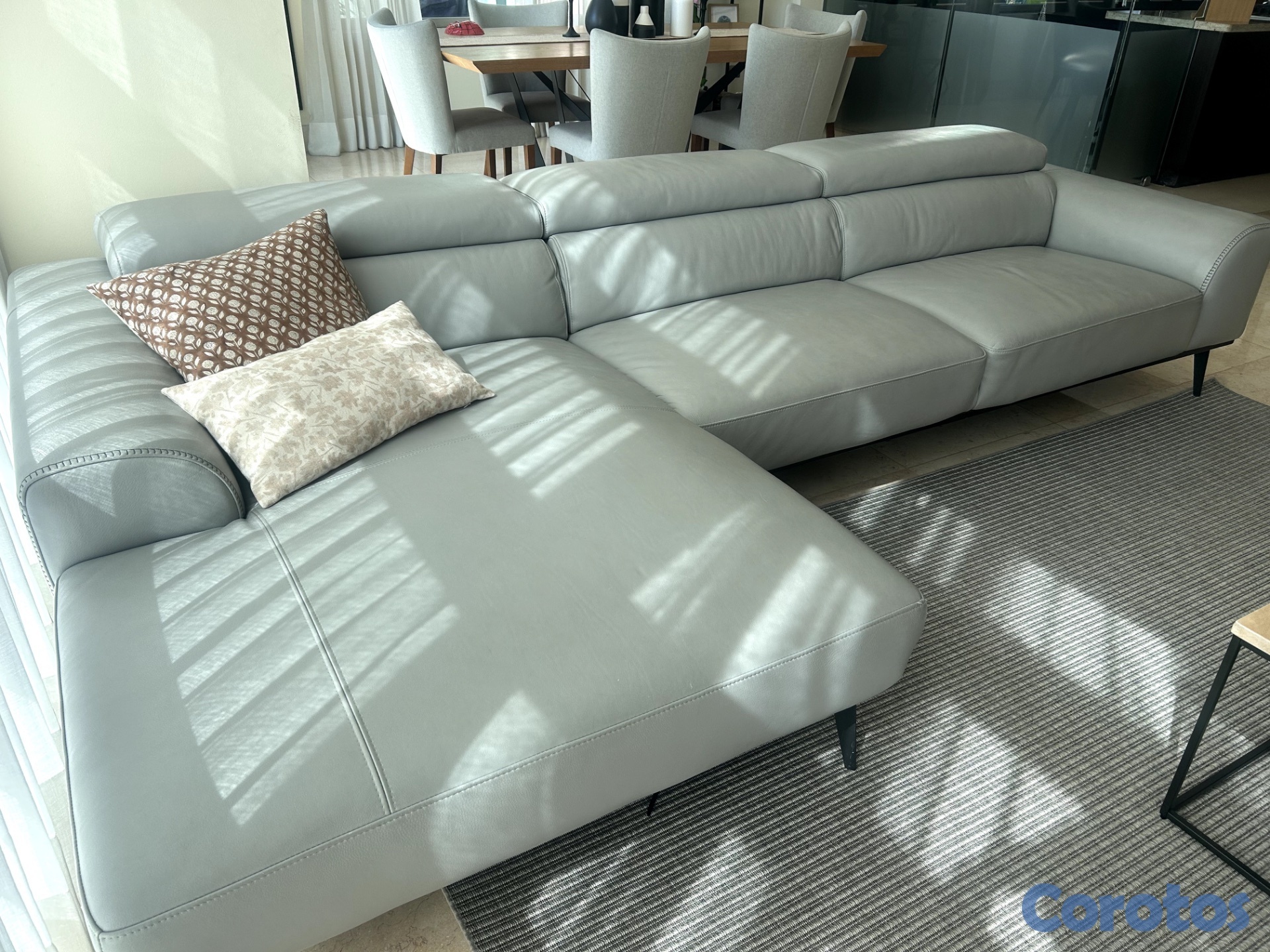 Sofá Chaise Lounge, en piel, color gris, patas en metal color negras.