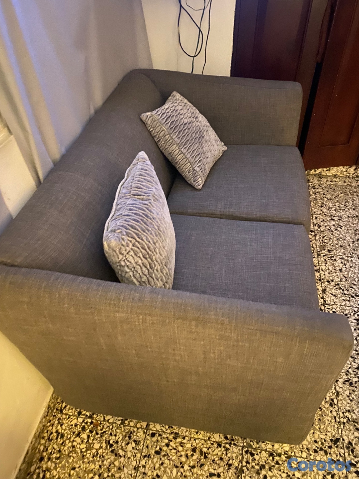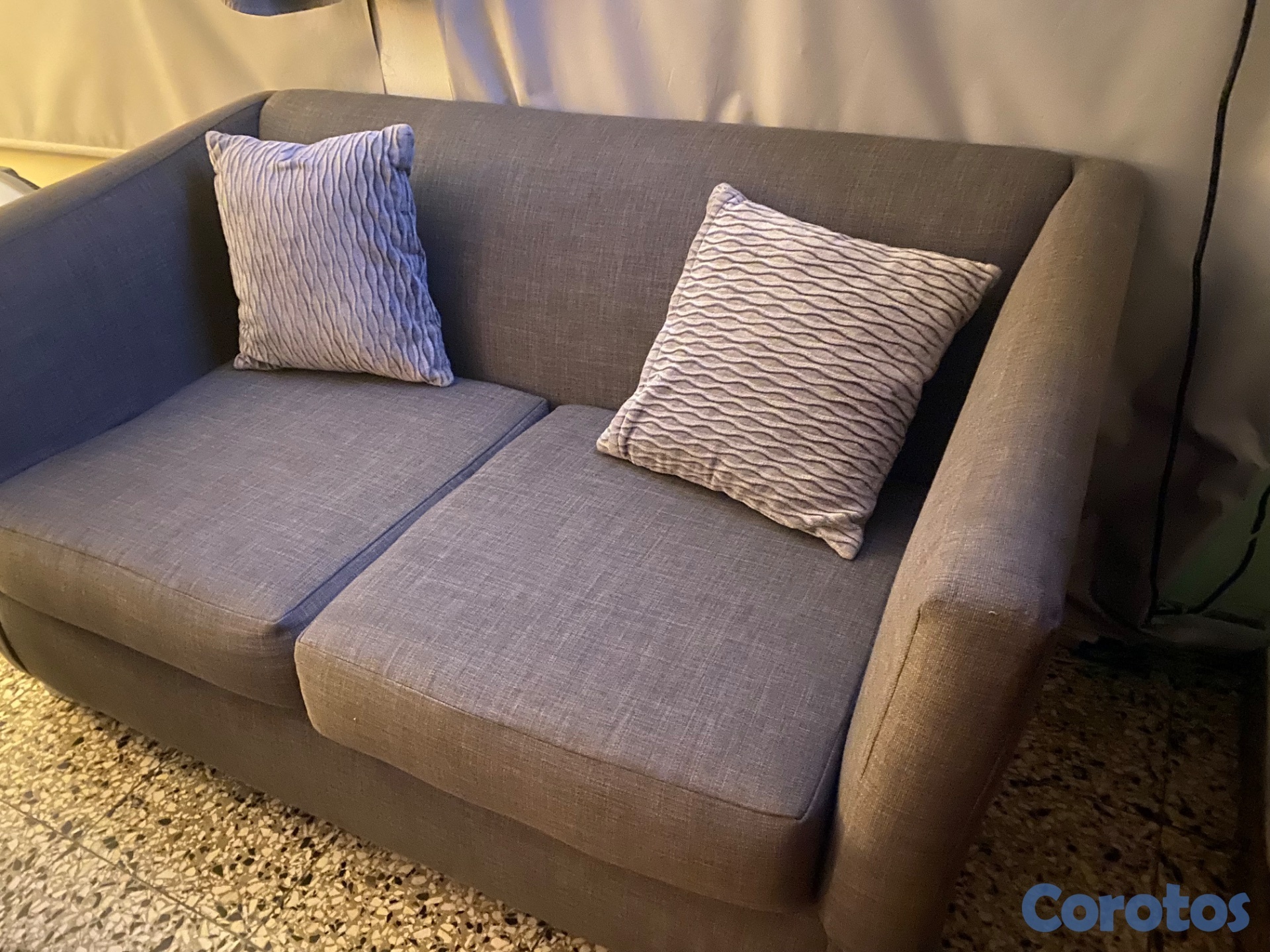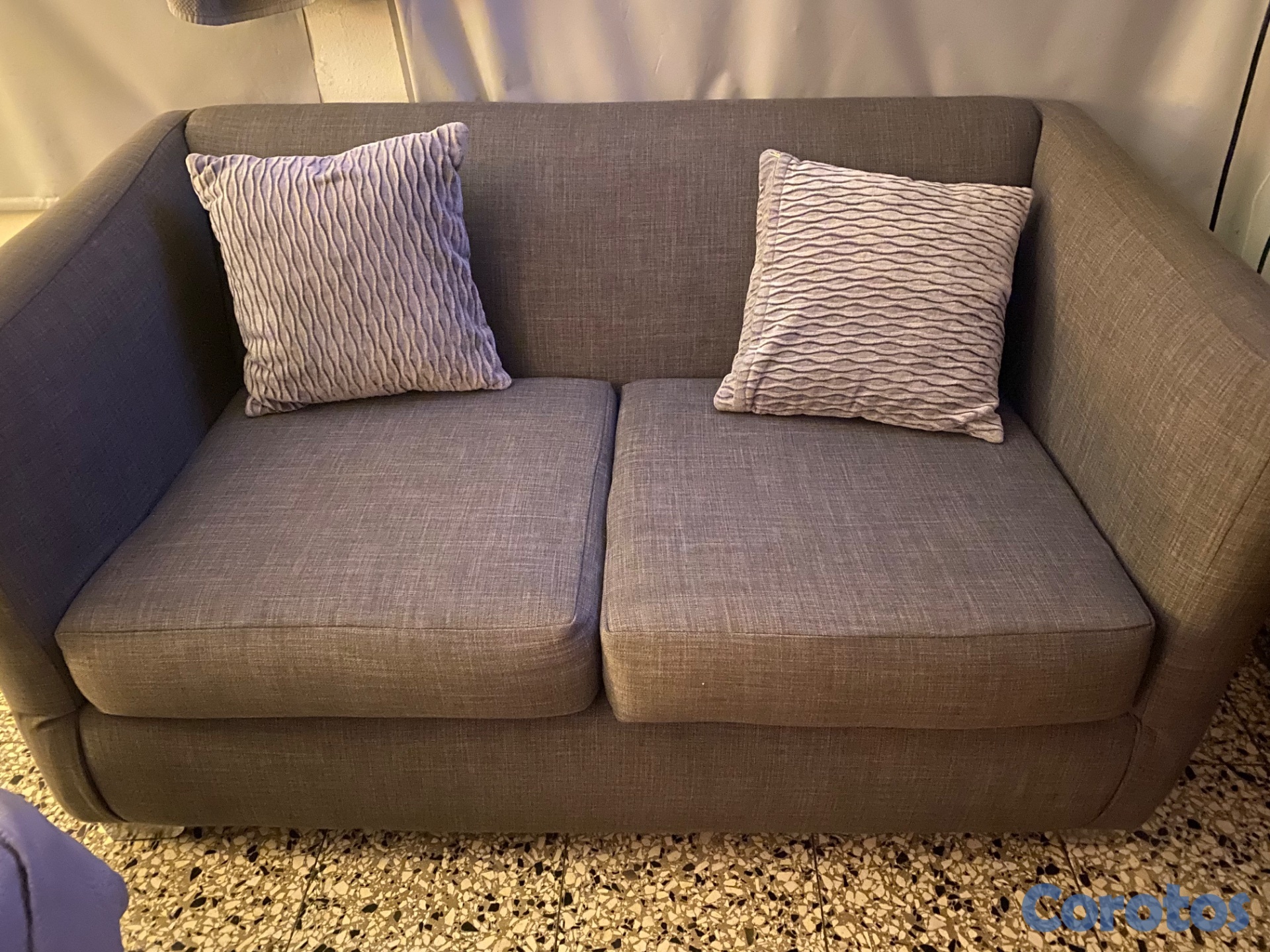 Sofá tapizado en gris, dos plazas, limpio en muy buenas condiciones. Negociable.
