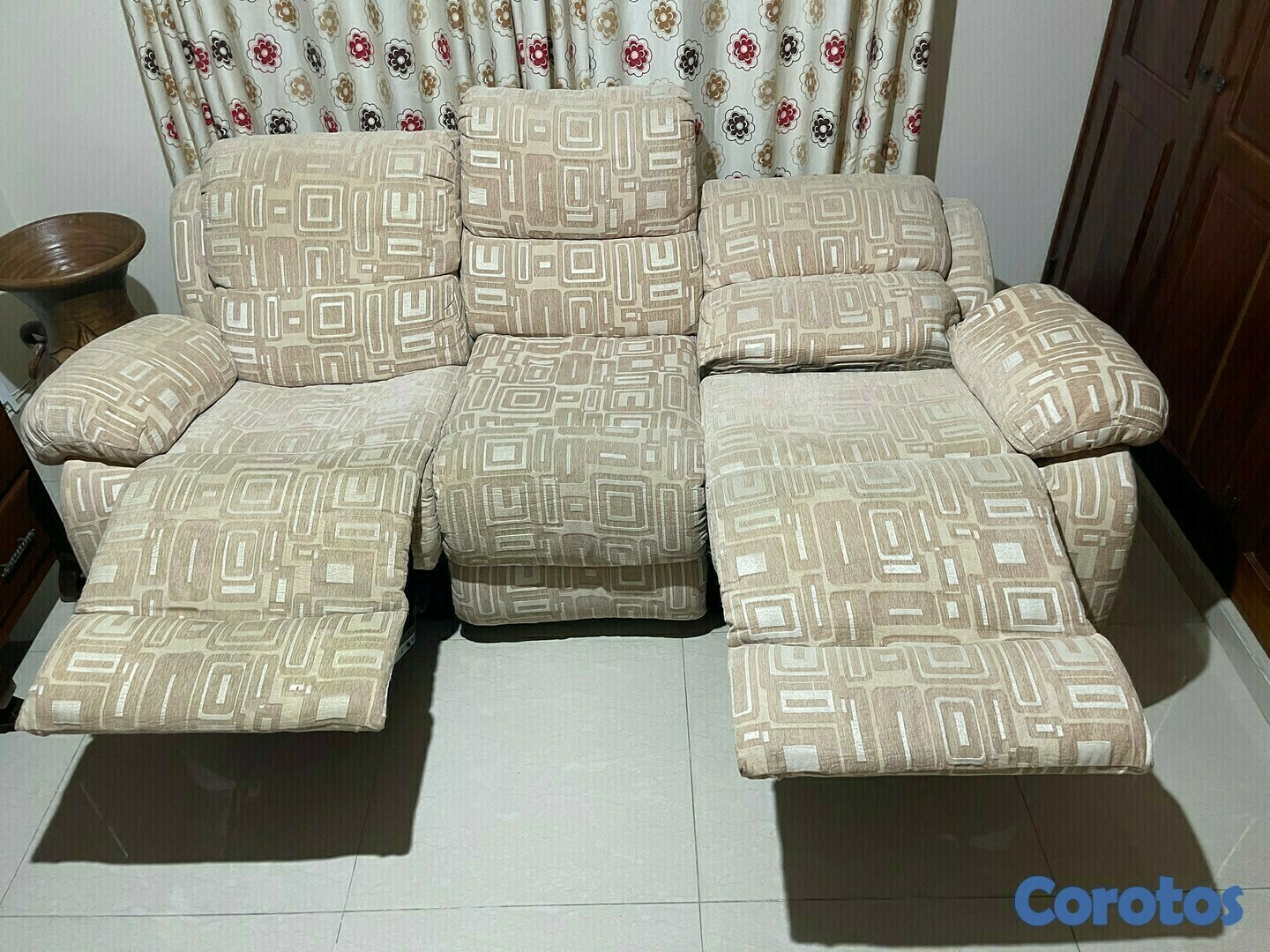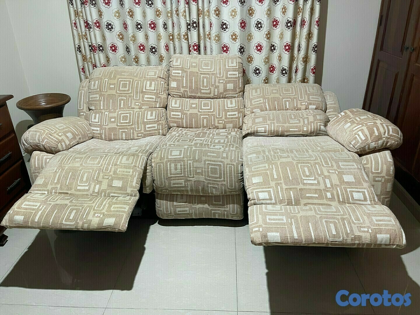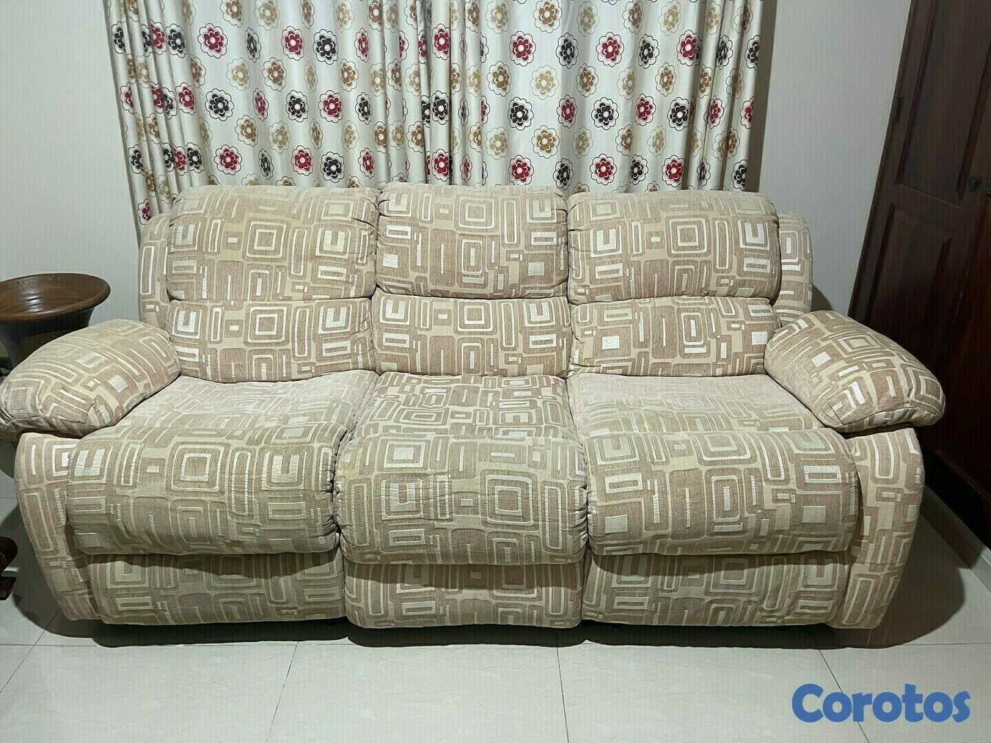 Sofa reclinable 2 + 1. Tapizado en tela y funciona perfectamente