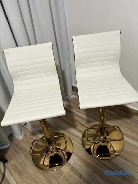 Modernos taburetes de bar de altura giratoria (360°) ajustable, con respaldo, ideal para mostrador de isla de cocina, diseño antideslizante, asiento de cuero sintético color blanco, base de metal color oro.