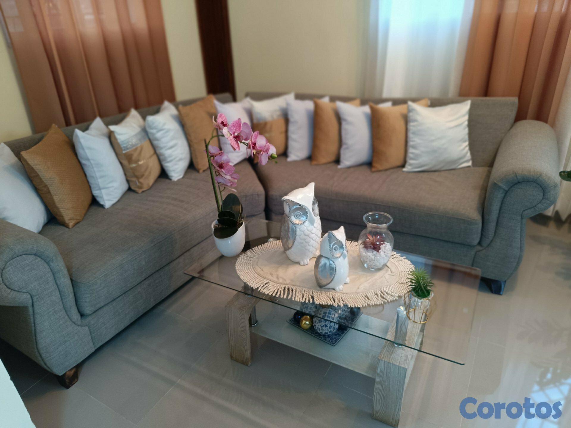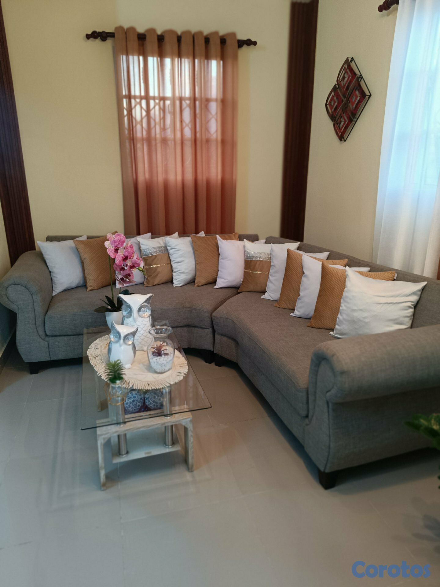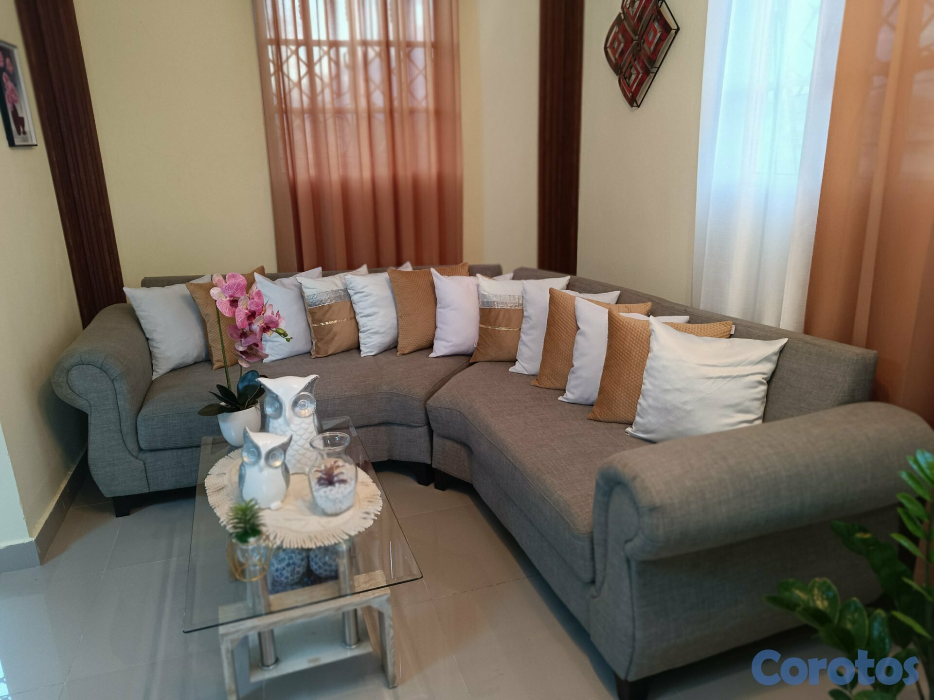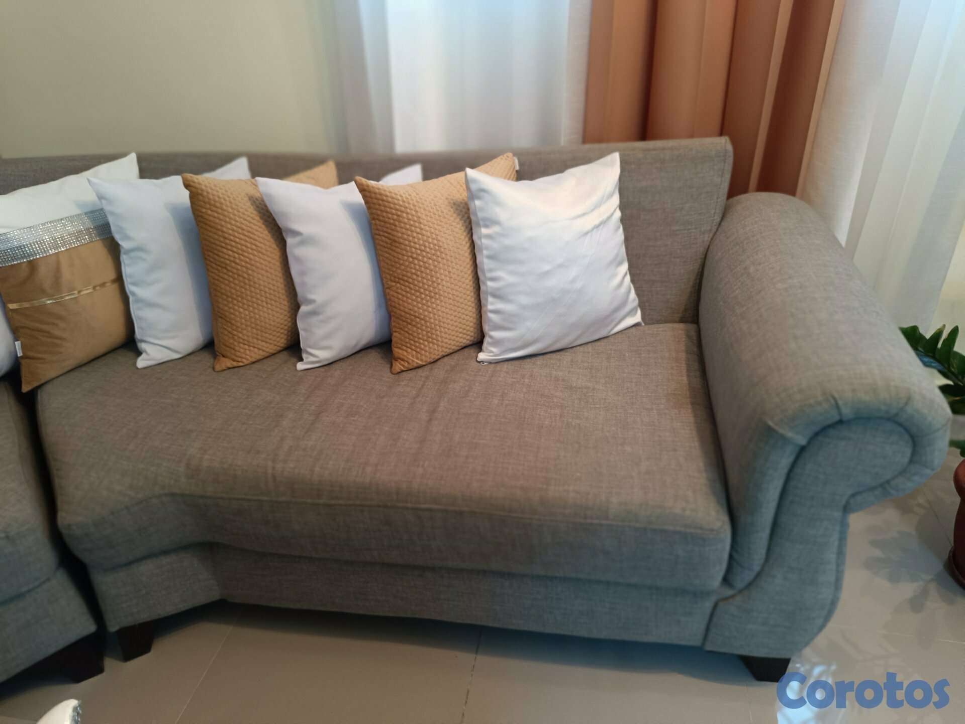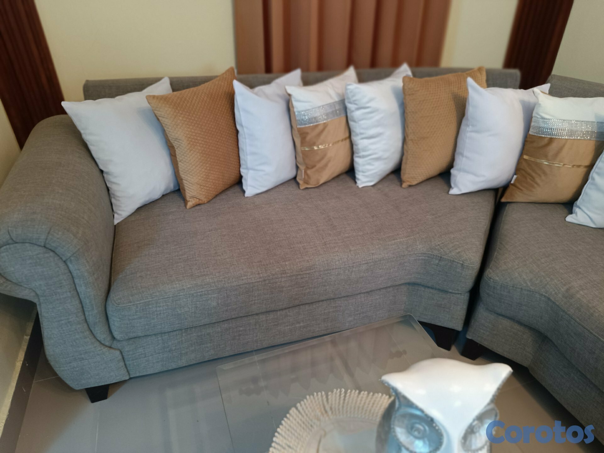 Venta de muebles cómodos y elegantes, en color gris, con cojines decorativos incluidos. Muy bien cuidados, ideales para sala pequeña o mediana, calidad de material 100%.