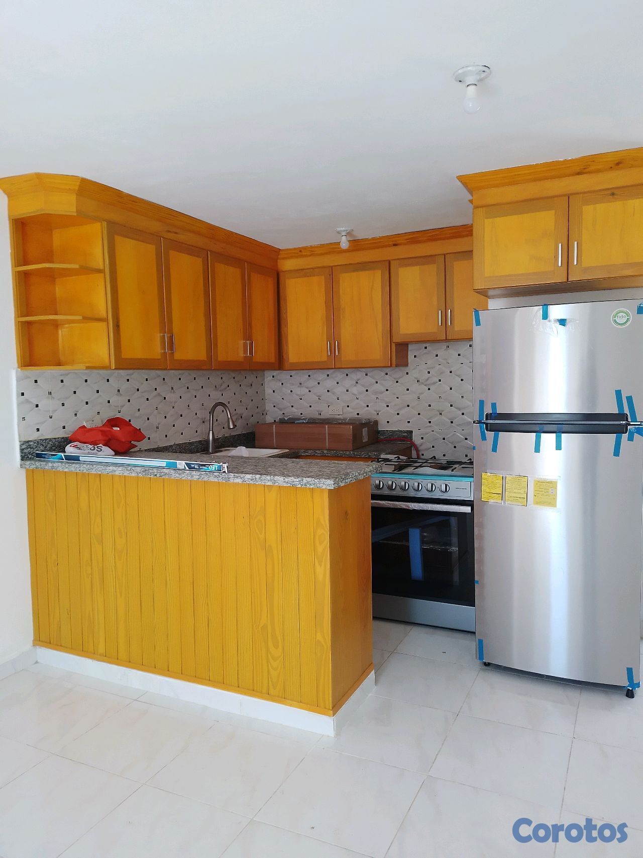 Sala, comedor, cocina con estufa y nevera