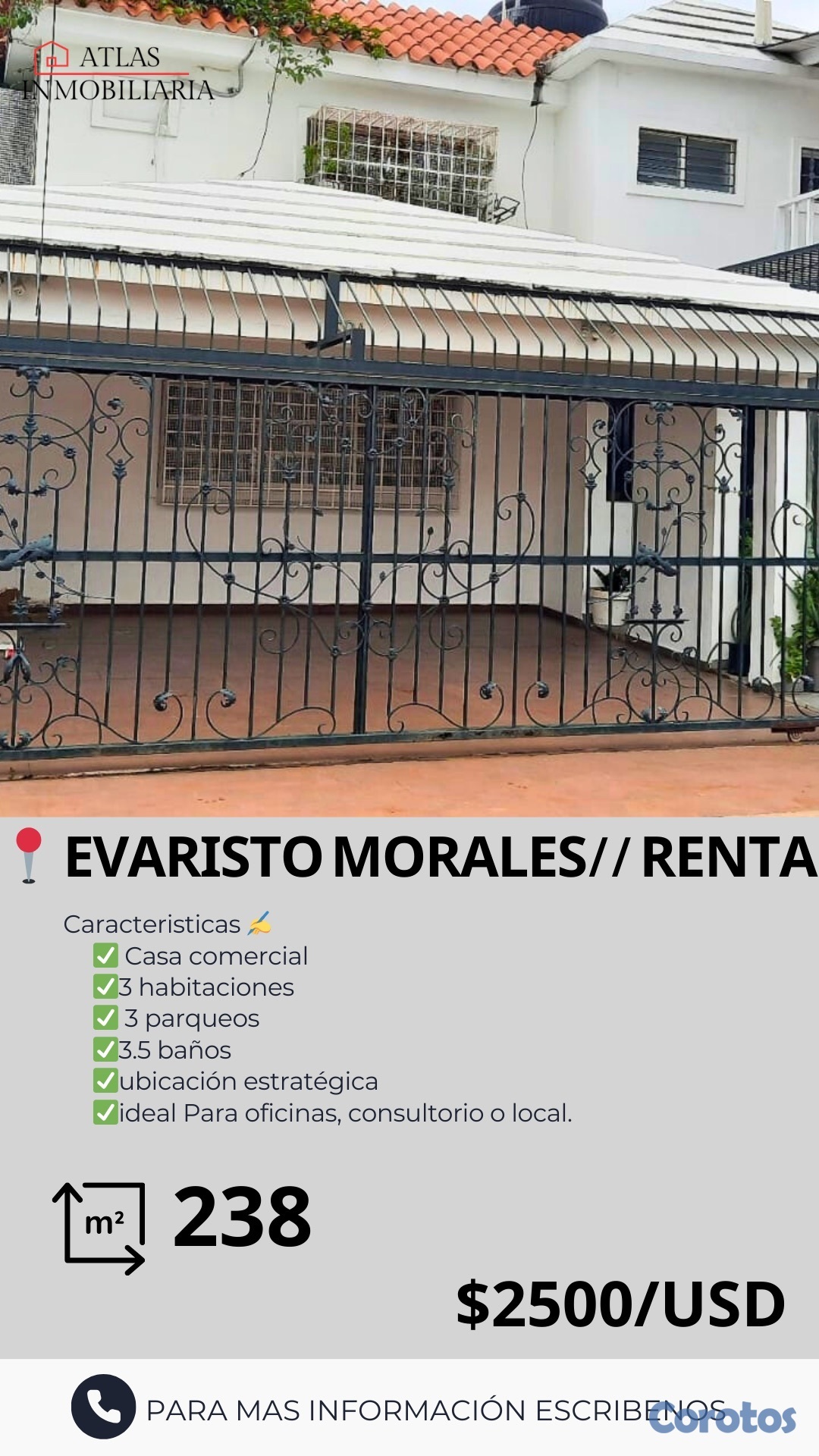 ▪️Consta de 193 metros cuadrados de terreno y 238 metros de construcción. Cuenta con 3 habitaciones, 3.5 baños y 3 parqueos. Puertas y clósets en caoba, cerámica importada española, sala y comedor separados. Ideal para oficinas, consultorios o local