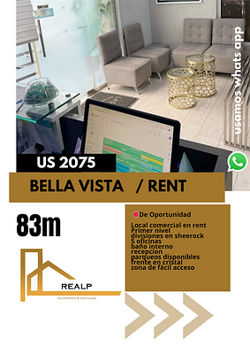Excelente local amplio con buena distribución para oficinas , consultorios o demás negocios que deseen un espacio en primer nivel en zona exclusiva de bella vista .