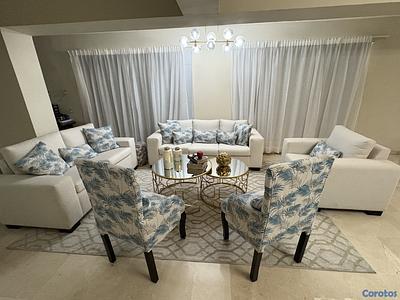 El apartamento tiene 212.00 m2 netos, (3) habitaciones, 3.5 baño, cuarto de servicio y área de lavado. Pisos en mármol, ebanistería en caoba, techos en yesos y cornisas en yeso, (2) Parqueos techados separados, lobby, ascensor, planta full, locker, ducto para basura, seguridad 24 horas, 3er nivel en USD$270,000.00 Neg.