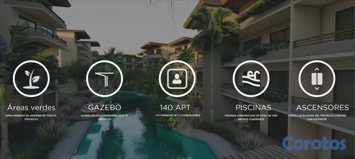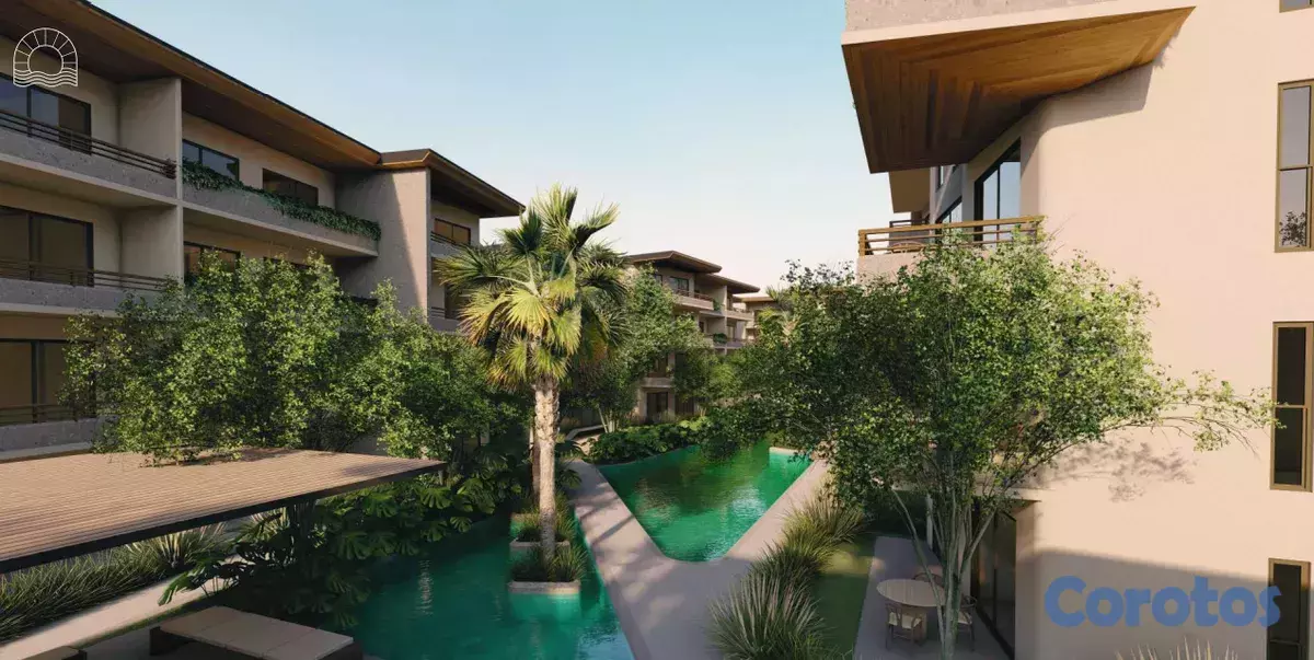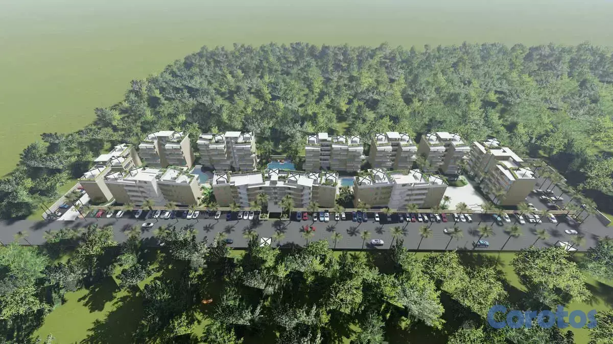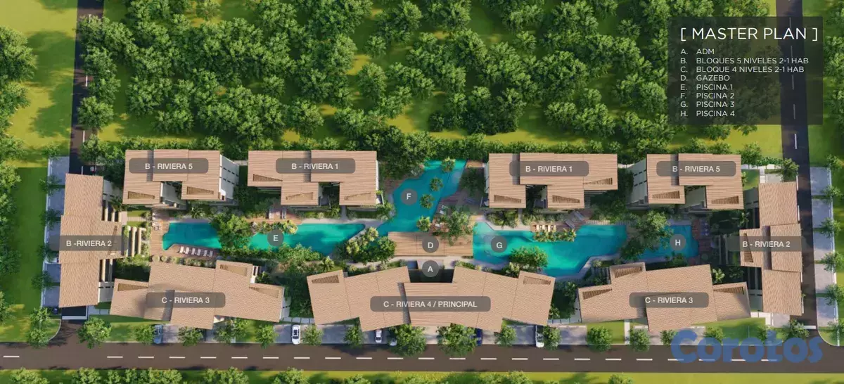 El proyecto presenta un moderno diseño arquitectónico, con toques rústicos, que se integran perfectamente con los jardines tropicales y las piscinas.