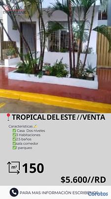 ▪️SE VENDE EN TROPICAL DEL ESTE, CASA 2 NIVELES, 3 HABITACIONES 2 Y MEDIO BAÑOS. SALA, COMEDOR COCINA, 1 PARQUEO, PROYECTO CERRADO, $ 5.6 NEG.