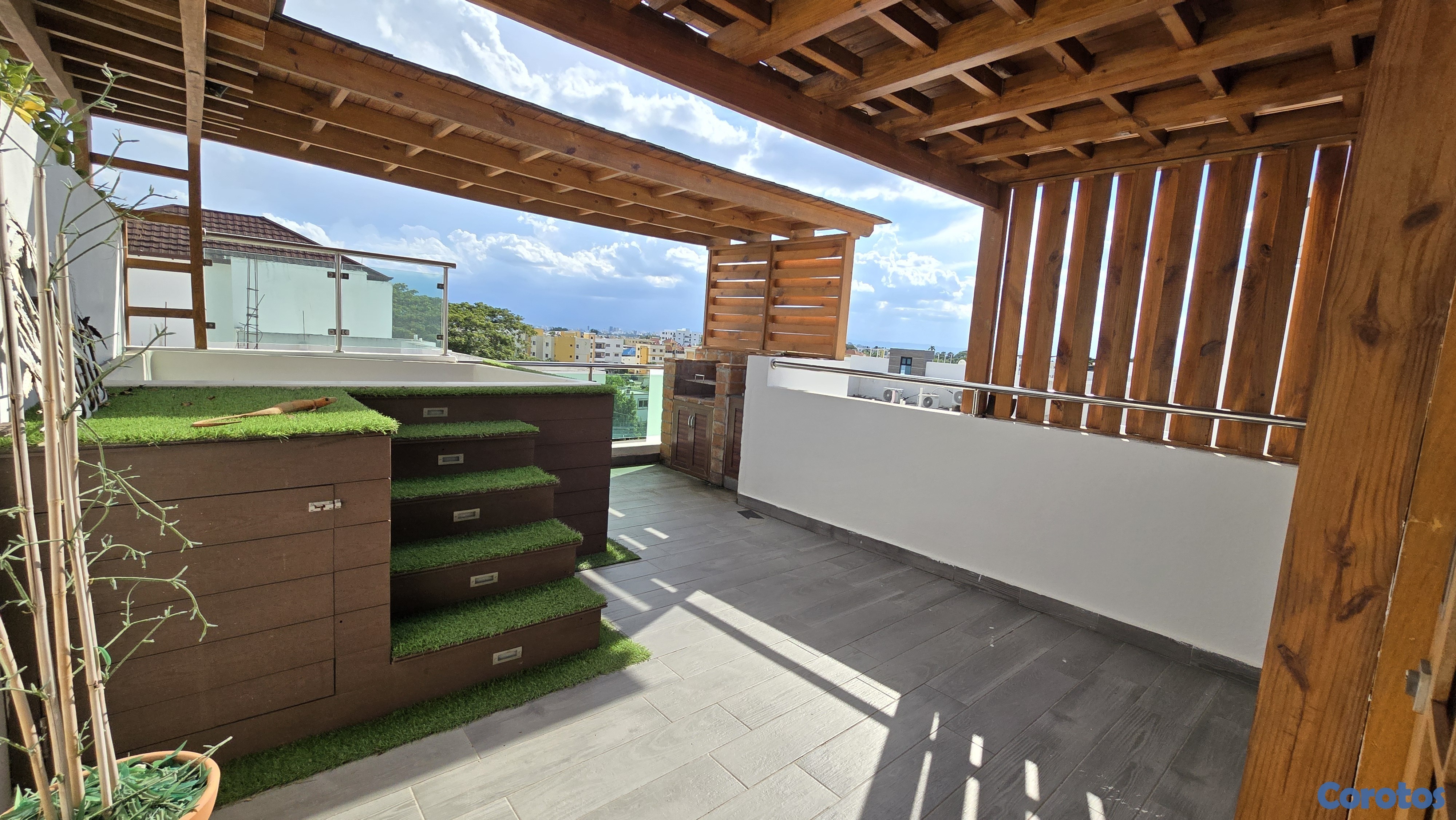 Terraza privada en el segundo nivel con jacuzzi y área de BBQ.