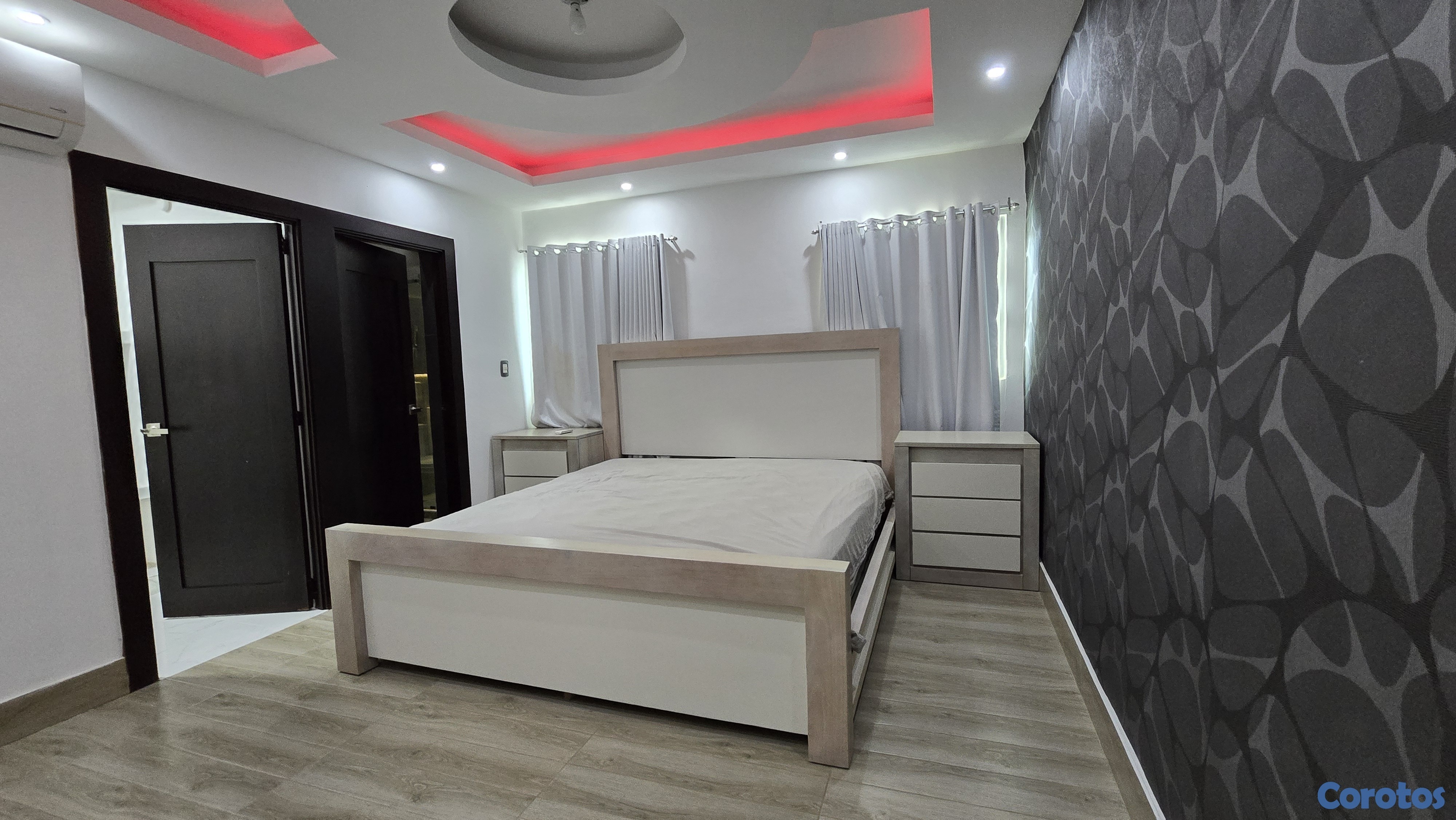 Acabados en madera de roble en gabinetes, puertas y closets.