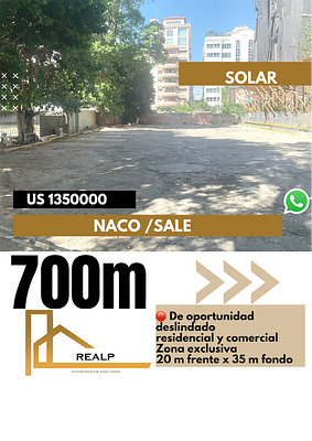 Excelente solar en zona céntrica y comercial de naco, deslindado , 20 metros de frente por 35 metros de fondo , ideal para proyecto residencial o comercial .