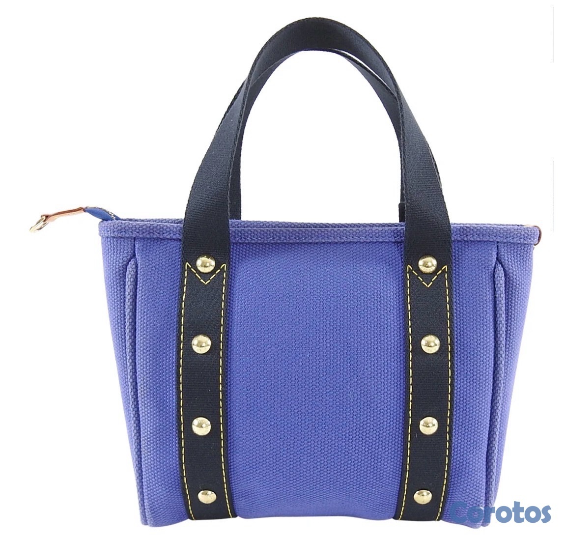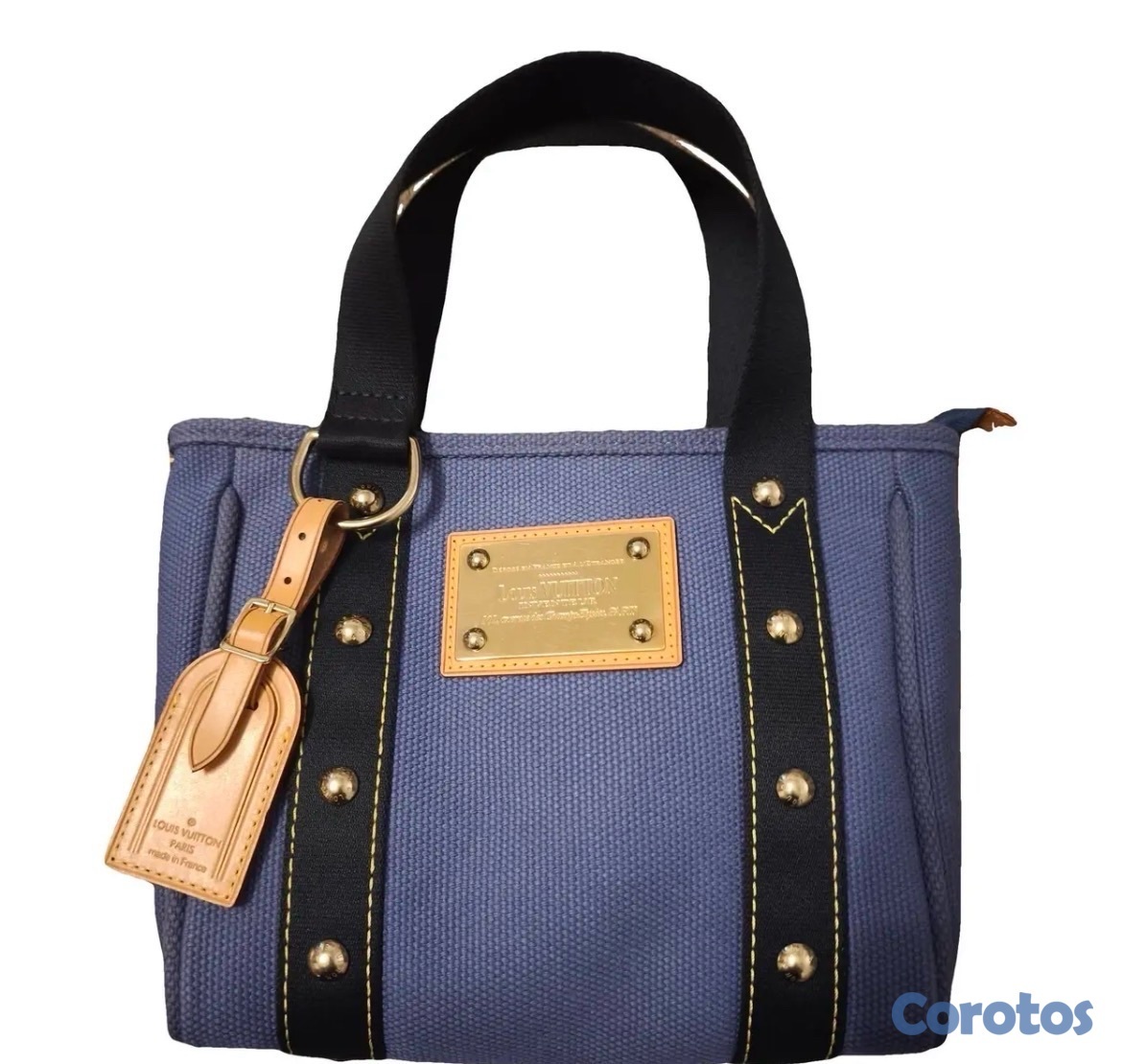 Louis Vuitton Antigua Cabas PM Canvas Bag in cornflower blue. Small canvas bag with top zipper, striped fabric lined interior, double canvas handles, gold logo plaque at front, vachetta leather luggage tag, and gold metal studs. Date code FL0036 for production year 2006. Measures 9 x 8.25 x 2.5”. Excellent pre-owned condition.