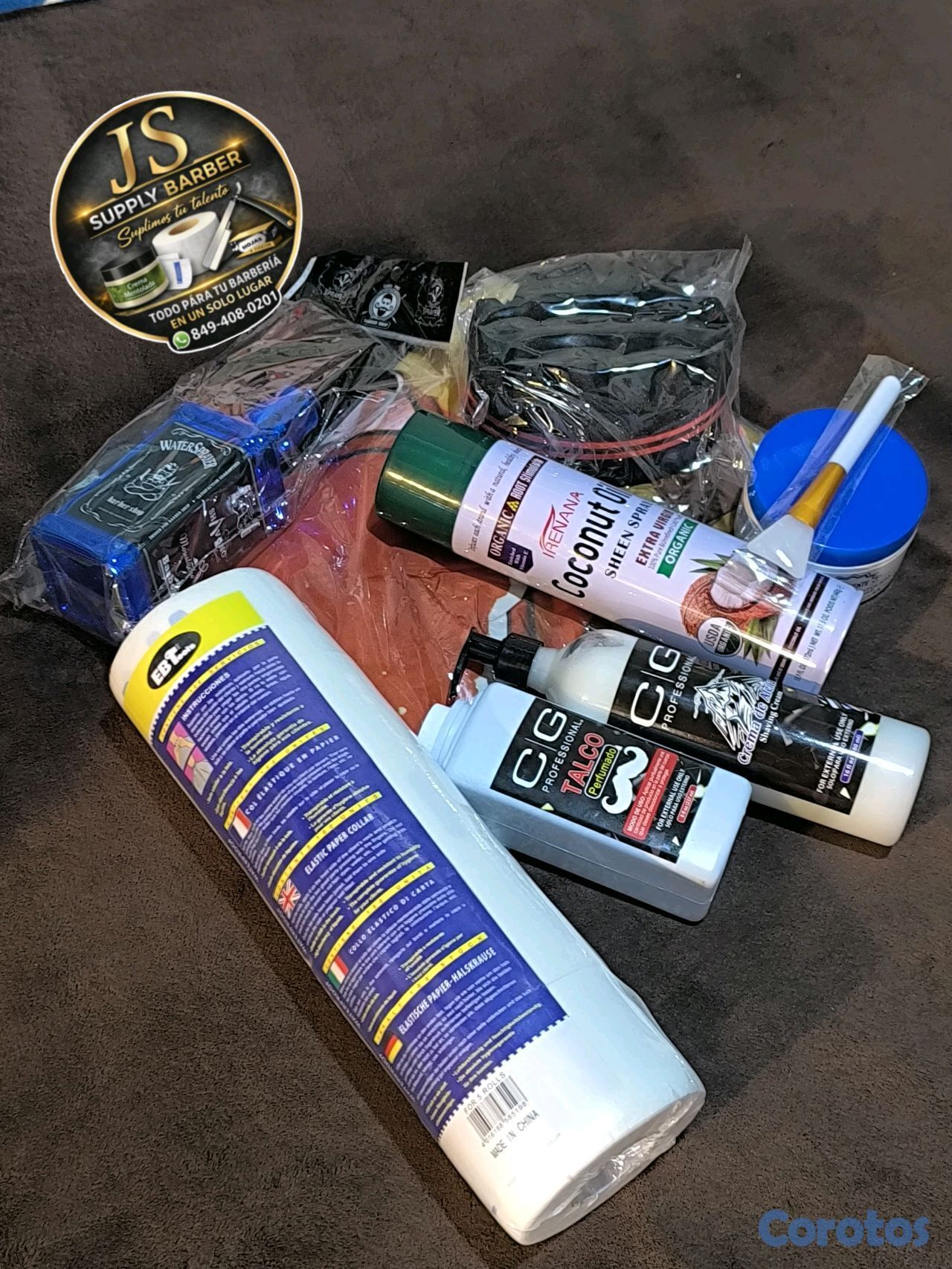crema mentolada, crema de afeitar, papel cuello, espátula de silicón, sponja para rizos, spray de coco y capa