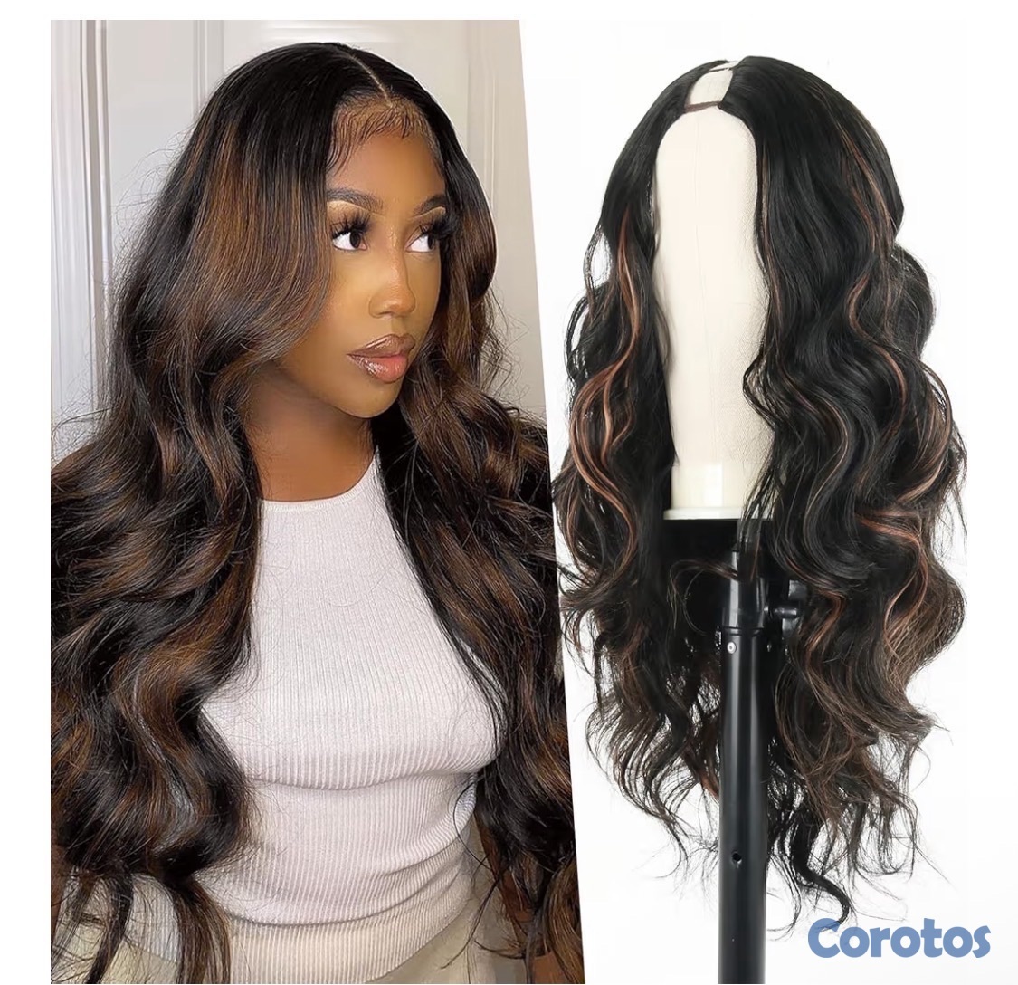 Peluca larga tipo V Part con ondas body wave, color negro con reflejos marrones. Peluca sintética water wave con clips, sin pegamento (glueless), cobertura completa, ideal para mujeres negras. Color negro mezclado con marrón