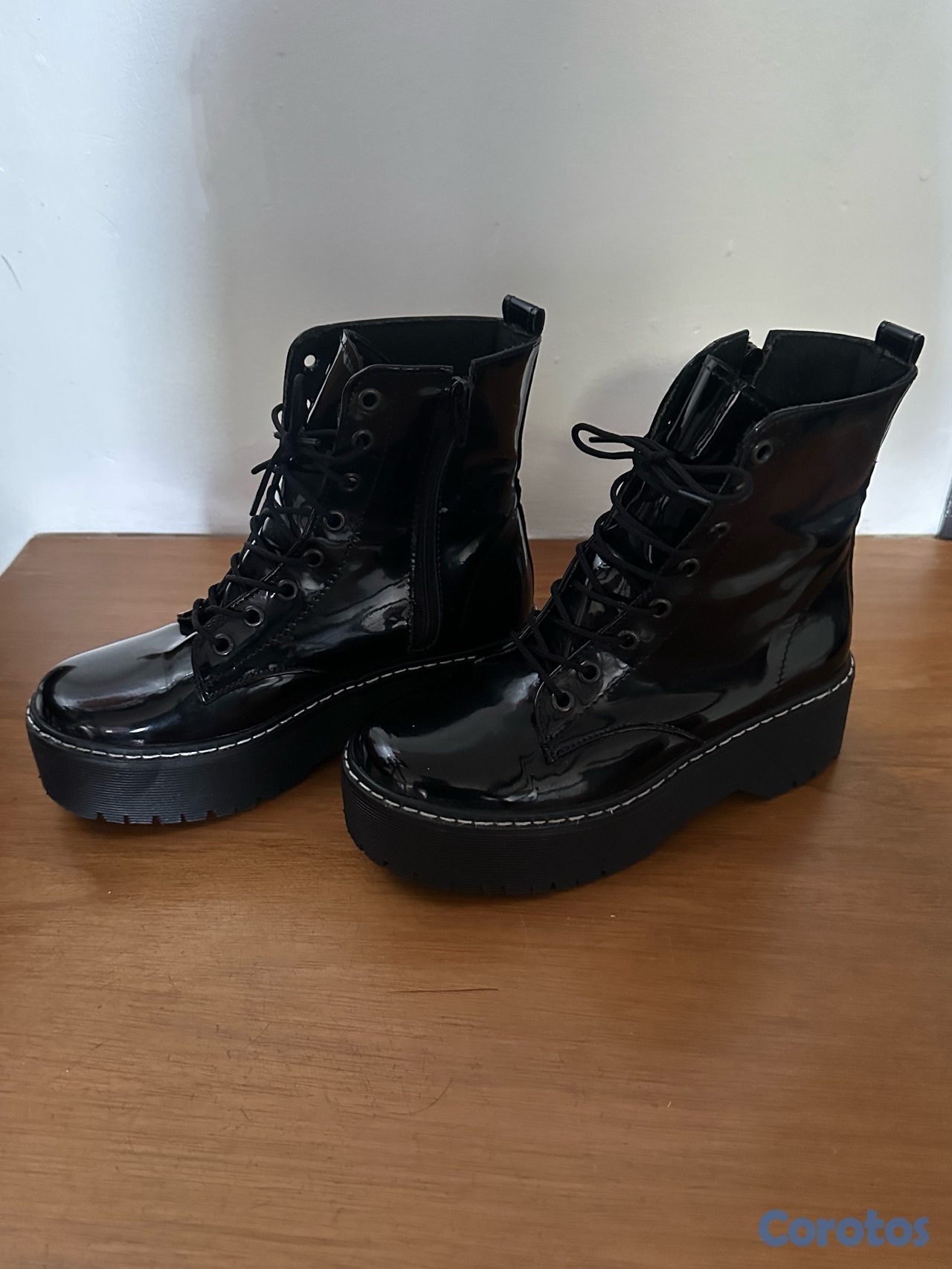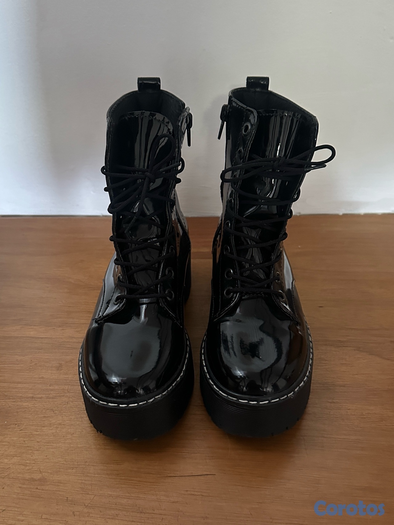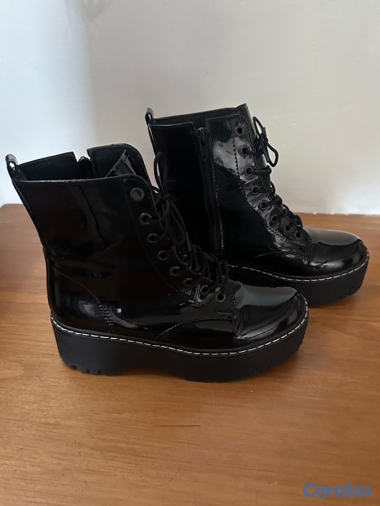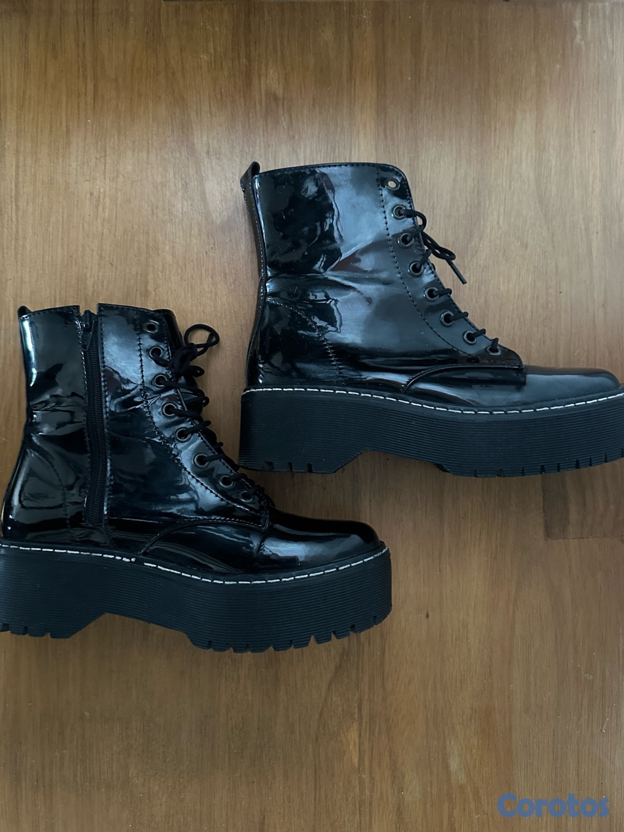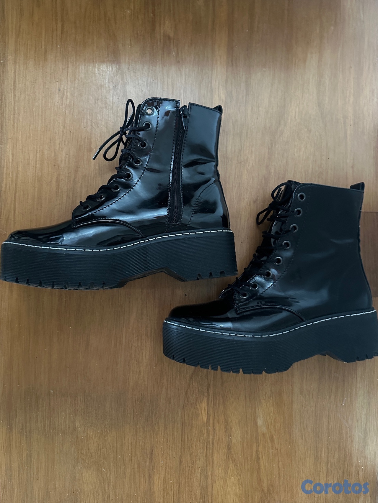 Botas negras tipo combat con plataforma, acabado brillante (charol), súper modernas y en tendencia. Tienen cordones al frente y zipper lateral para mayor comodidad al ponerlas. La suela es gruesa y cómoda, perfecta para usar todo el día sin sacrificar estilo. Ideales para outfits casuales o más atrevidos, combinan fácilmente con jeans, faldas o vestidos. En muy buen estado, poco uso.