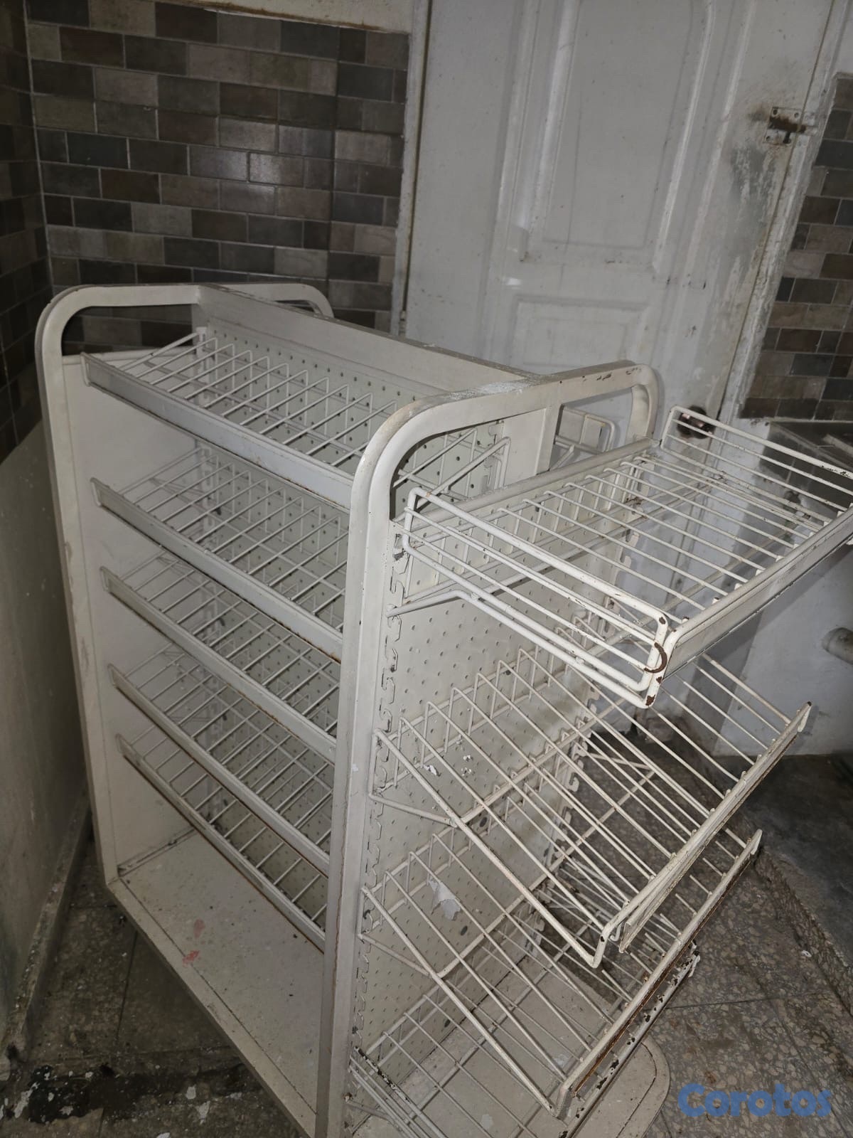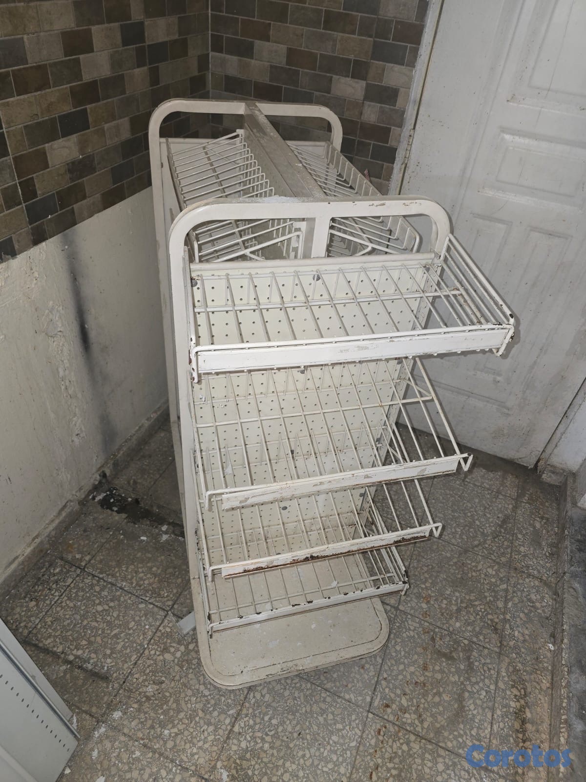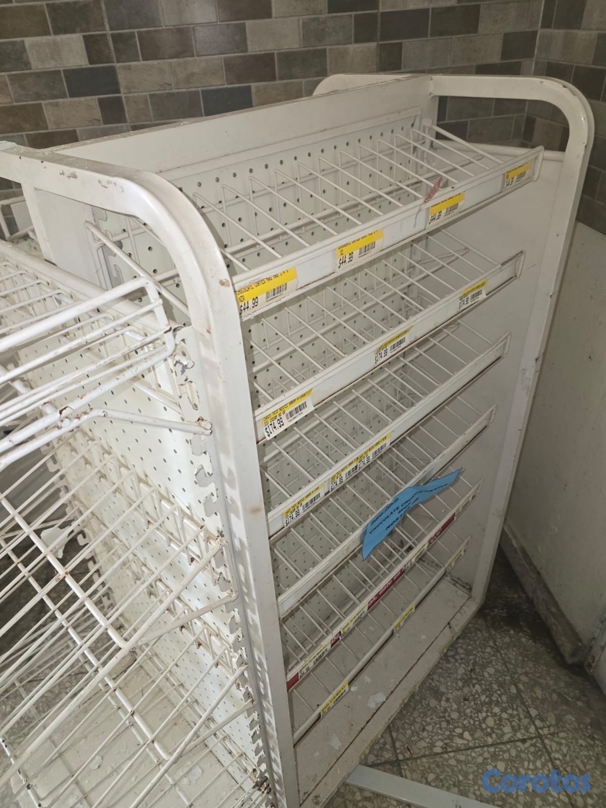 Este artículo es un exhibidor de piso para retail (comercio), específicamente un estante metálico de rejilla diseñado para productos ligeros como golosinas, snacks o artículos de papelería.