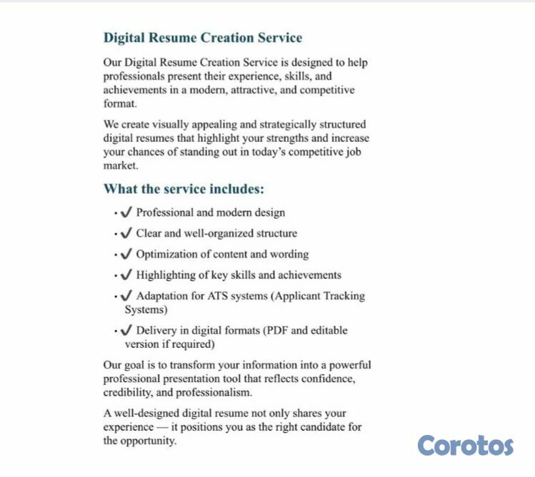 Our Digital Resume Creation Service is designed to help professionals present their experience, qualifications, and skills in a powerful, modern, and competitive format. In today’s fast-paced job market, having a professionally designed resume is essential to stand out and make a strong first impression.