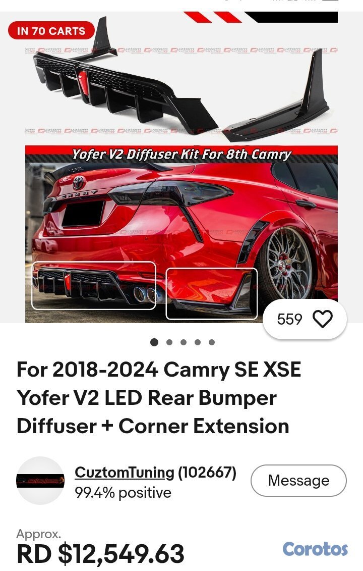 PARA TOYOTA CAMRY SE XSE V3 2018-2024 NEGRO BRILLANTE PARACHOQUES TRASERO DELANTAL DE ESQUINA ESPATAS.